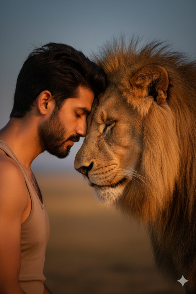 Create A poignant and deeply emotive medium close-up shot, captured at eye level, depicts a serene moment between this man and a majestic male lion. The man, with his eyes gently closed, presses his forehead tenderly against the lion’s forehead, creating a profound sense of connection and peace. The lion also has its eyes softly closed, mirroring the man’s tranquility. The man is positioned on the left side of the frame, his upper body visible, wearing a simple, light brown or beige tank top that subtly catches the warm, golden hour light. His skin, a warm, natural tone, shows subtle textures and the soft glow of the setting sun. The lion, occupying the right side of the frame, is a powerful presence, its rich golden-brown mane beautifully illuminated by the same warm light, creating a halo effect. The intricate details of its fur and whiskers are sharply defined. The background is a soft-focus, ethereal landscape bathed in the hues of twilight – a gradient from a deep, muted blue sky at the top, transitioning into a subtly lit, warm-toned savanna or grassy plain below, suggesting an open, natural environment. The lighting is key, with a strong, warm directional light source coming from the right, creating soft shadows and enhancing the textures, emphasizing the intimate bond between the two subjects.