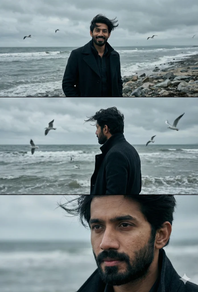 seagulls flying nearby. frame 3 (bottom): close-up emotional portrait – wind